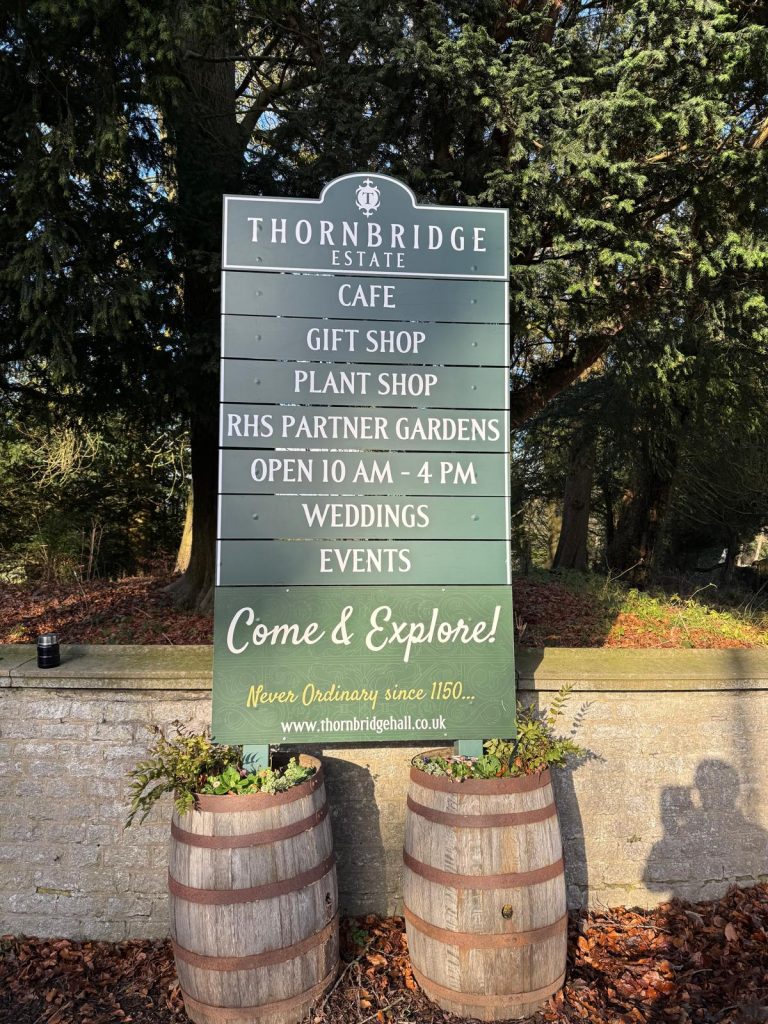 For one of our long-term clients, the owners of Thornbridge Hall, near Ashford-in-the-Water, we were appointed to create and install new signage to direct members of the public arriving by car to the cafe, gardens and emporium, and also for wedding guests.